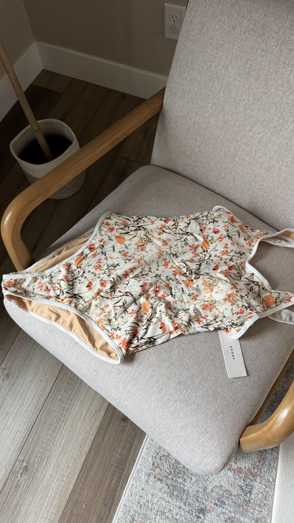 Where flirty feminine prints blend perfectly with sporty flair; meet the Costa One-Piece Swimsuit. This modest swimsuit boasts a timeless wildflower print on a cream colored background, paired perfectly with a bold white trim. The details on the open back are enough to make you swoon with thick, supportive, straps paired with a classy gold clasp to offer optimal bust support. Our higher leg cut maintains great booty coverage while flattering your curves. This one's an automatic confidence boost every time you put it on.