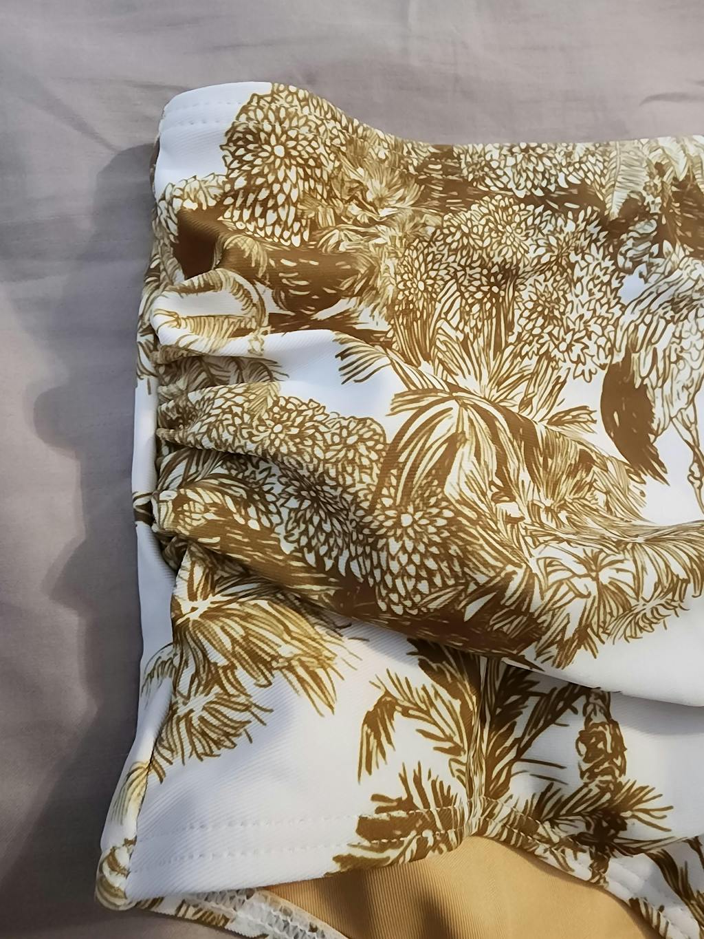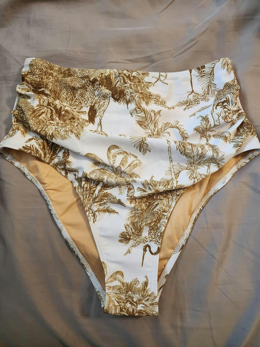 The quality was great (although I haven't worn it enough times to know long term yet). I did wash it by hand and let it air dry per the instructions. I know a lot of people were saying the color isn't as pictured. I will say that it looks a tad more gold in the photos online. But some people were saying it looks green in person. I think this is one of those things we're it depends on how the person perceives color. I could see a slight green undertone possibly. But overall the color of the print looks more tan/gold to me in person. The white is a true white as well. Overall I'm happy with the swimsuit so far.